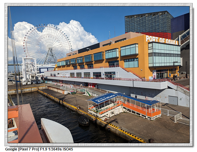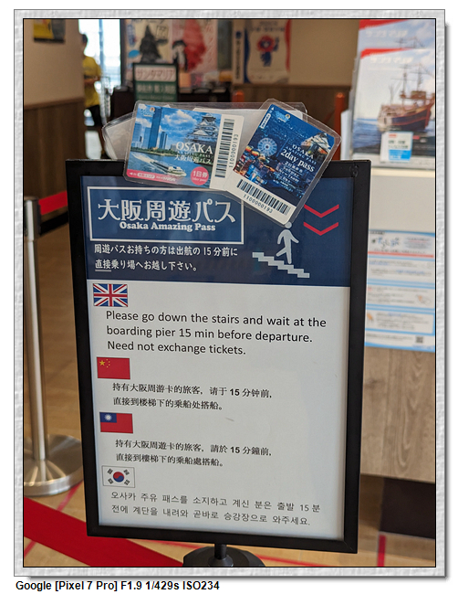 接下來又回到海遊館,這次要來搭乘帆船型觀光船 聖瑪麗亞號。這也是周遊券可以免費搭乘。我們抵達時剛好3點,前一艘船已經出發了,所以我們要等待4點的船班,依據門口的提示,持周遊券不用換票,但需提前15分鐘排隊。