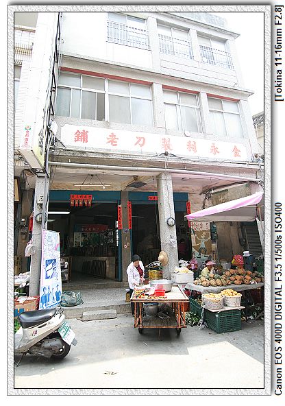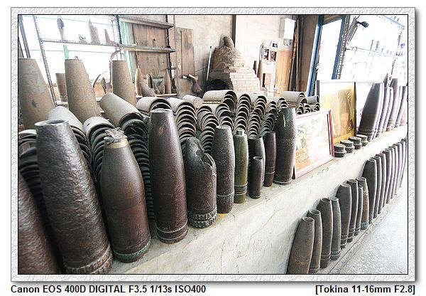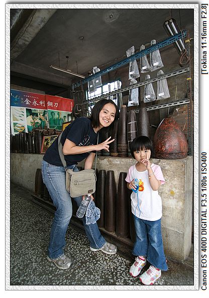 吃飽後閒晃,再逛完「邱良功母節孝坊」以及「觀音亭」之後,突然看到有間店鋪內有很多砲彈。雖然大家都知道金門鋼刀有名,但卻不知道所買的鋼刀是不是真的是用砲彈做的。