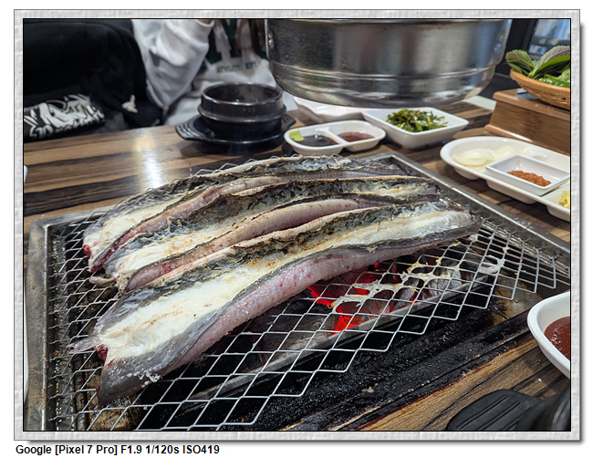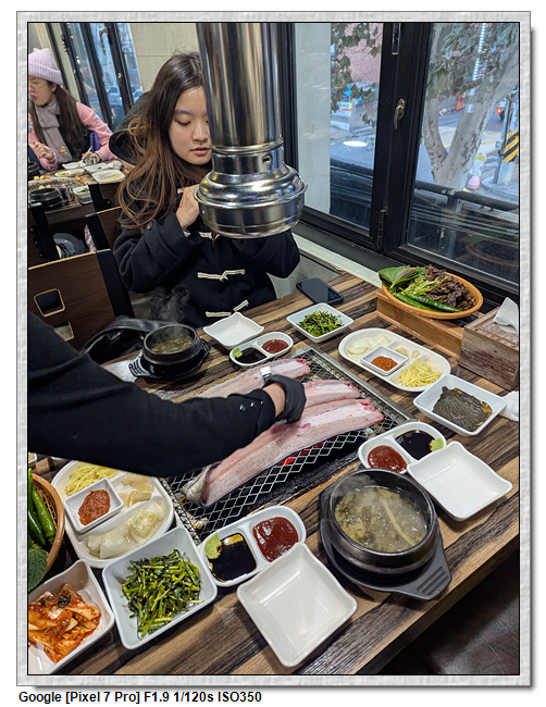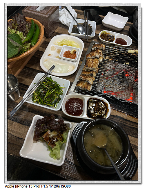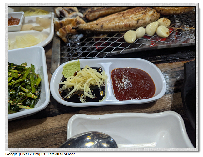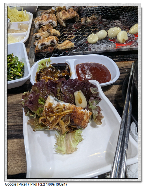 第一次吃烤鰻魚,以往都是吃那種日式鰻魚飯的鰻魚,偏油但很好吃,這次的烤鰻魚沒那麼油,也沒甚麼魚刺,加上各式樣的配菜,還真的好吃,我們很快地就把配菜吃完,店員很快地就自己幫忙補上一份配菜。