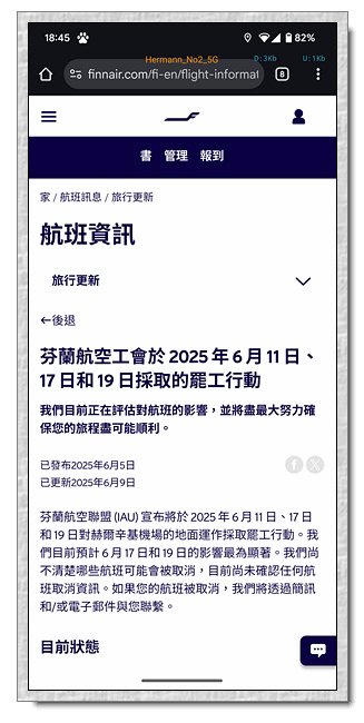 正當準備開始旅途的一週前,晚上突然看到芬蘭航空的mail (6/9寄出,6/10才看到),大意是說芬蘭航空聯盟(IAU)宣布要在6/11、6/17、6/19在赫爾辛基機場採取影響地面運作的罷工行動。6/9已取消6/11的航班,6/19的航班要等到6/17才知道會不會取消。