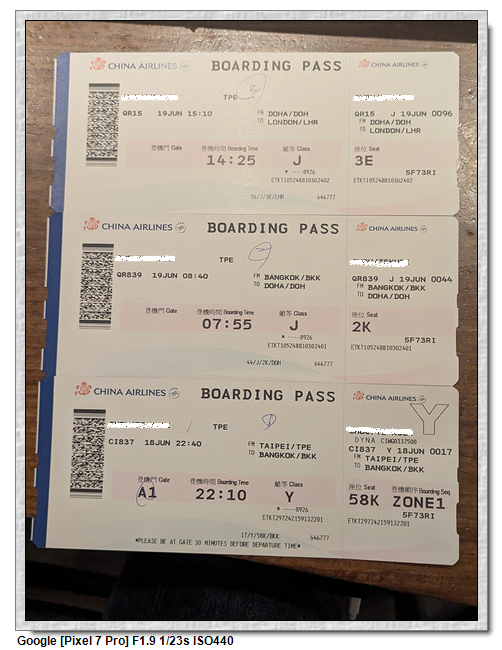 出發當天,使用信用卡附贈的接送機場服務,順利抵達桃園機場第一航廈。在中華航空辦理登機作業時,櫃台地勤一度告知我們要在曼谷機場拿行李後再登機,但小羽媽表示希望能直掛到倫敦,一開始櫃台地勤面有難色,但還是很積極地幫我們處理(跑來跑去找資深人員詢問怎麼處理),最後還是幫我們將行李直掛到倫敦,這真的很有幫助,也很貼心地告知到曼谷時,要詢問卡達航空行李是否有接上。