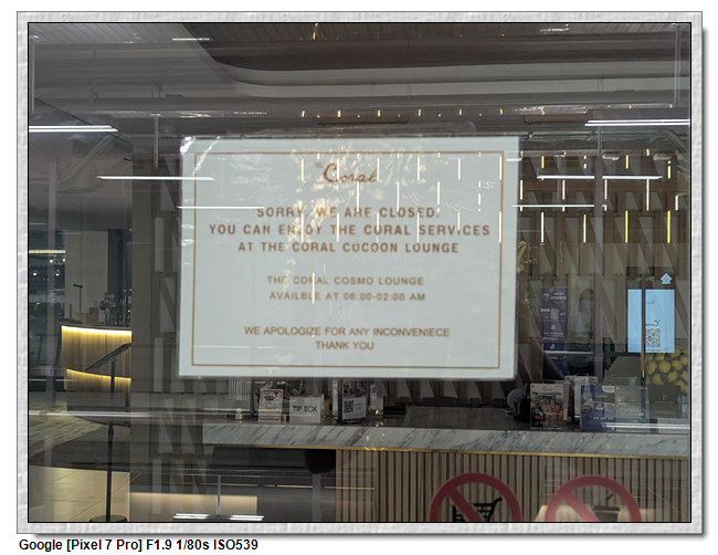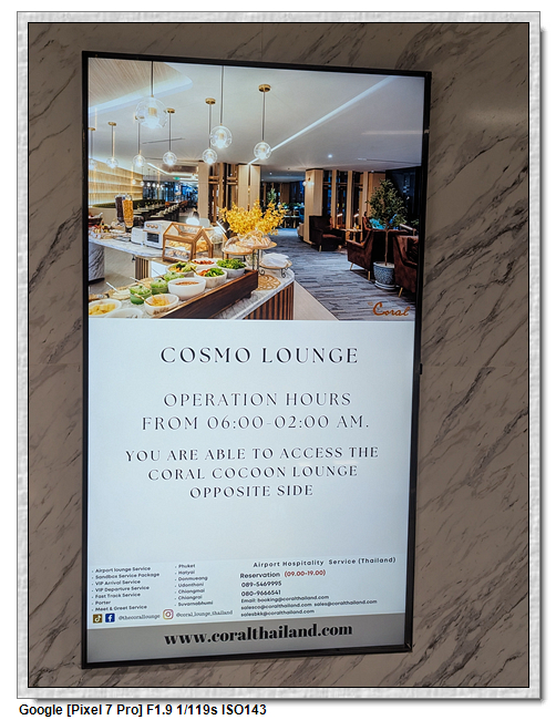 過了轉機檢查後,我們先找到卡達航空的轉機櫃檯位於轉機櫃檯1號,但現在轉機櫃檯都沒人,而出發時間是07:05,也就是說還要等到四點才會有人。中國信託信用卡目前的等級有提供一年使用國際機場貴賓室4次的服務,正、附卡持卡人合計算使用次數。 因此我們就先找中國信託配合的貴賓室 The Coral Cosmo Lounge,已經事先查到貴賓室在3樓,靠近C2登機門,有點遠,於是就慢慢地走過去。
