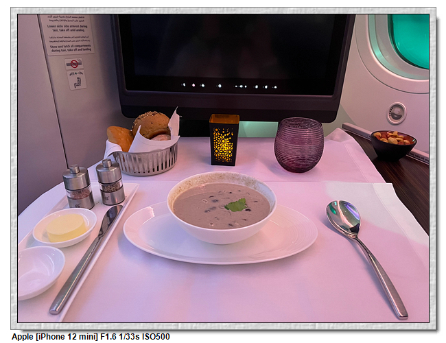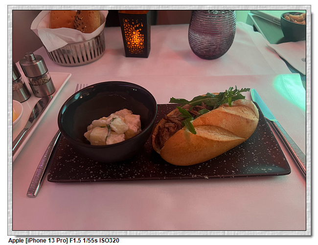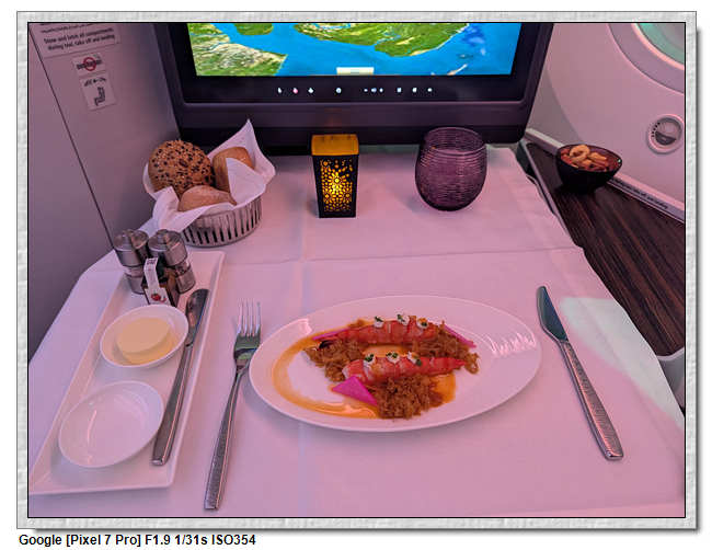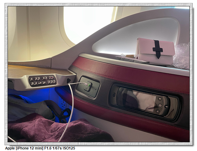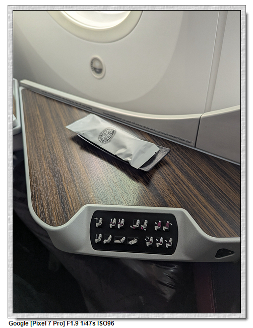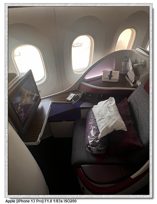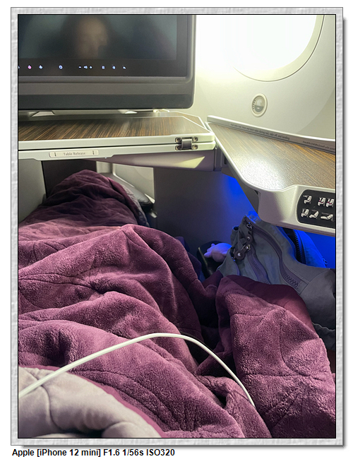 第一次坐商務艙,感到很新奇,很像鄉巴佬似的對於每個物品都很好奇,空服員還有詢問是否要睡衣,我們是拒絕了。商務艙的空服員看起來沒有經濟艙的忙碌,經濟艙的空服員都一直快速地走來走去,而商務艙的空服員就很有耐心的介紹餐點以及座位的用品(聽不懂也會盡量用簡單的單字解說),真的是一個座位一個座位的講解。 商務艙的座位大小應該有4-5個經濟艙的空間,當然這也反映在價格上,但如果把空間與價格相除,似乎也沒那麼貴了。起飛後大約一小時開始用餐,但也可以選擇想要用餐時再用,我看身旁其他旅客都是飛到一半時才用餐(3小時)。用餐也很有儀式感,會先鋪上桌巾,擺上餐具,還有小電子蠟燭,感覺就像是到餐廳用餐一樣。