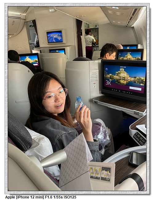 ▼【商務艙的座位,超大螢幕;男生是黑色過夜包,女生是白色過夜包】