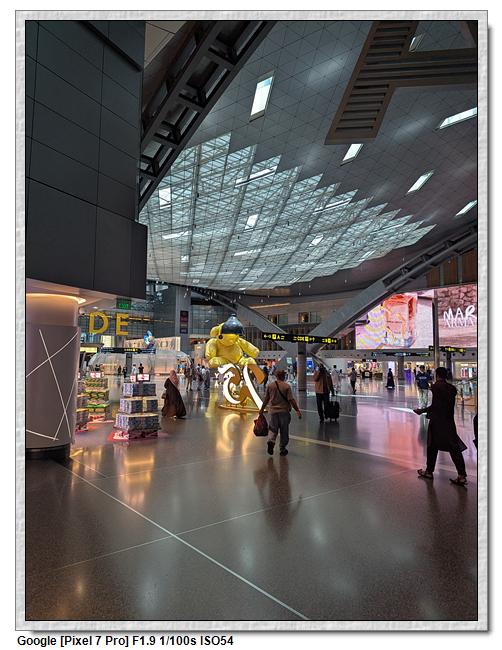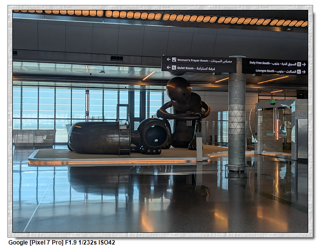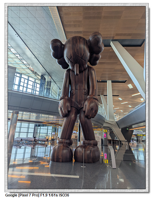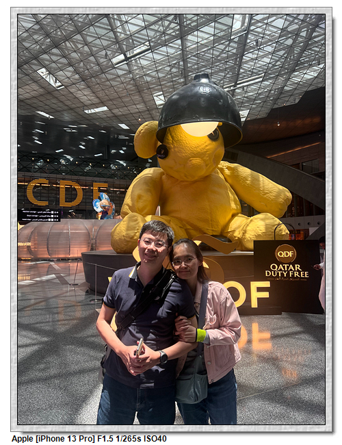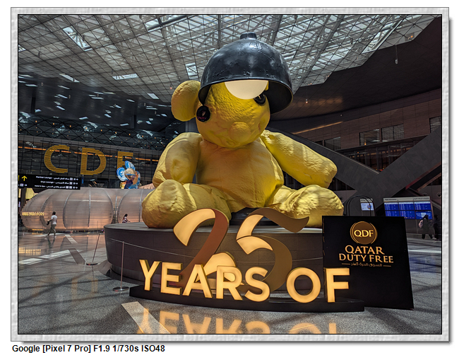 卡達航空在哈馬德國際機場有兩間商務艙貴賓室(Al Mourjan business lounge 及 Al Mourjan business lounge - The Garden)以及一間頭等艙貴賓室(Al Safwa First Lounge),其中 The Garden 是在2023年新開的,難得來到杜哈,當然是去新的貴賓室。 尋找貴賓室,首先要找到「頭卡在檯燈裡的泰迪熊」地標,這隻泰迪熊聽說是在2011年由卡達某一個皇室成員以680萬美元競標價格在紐約的拍賣會買下。