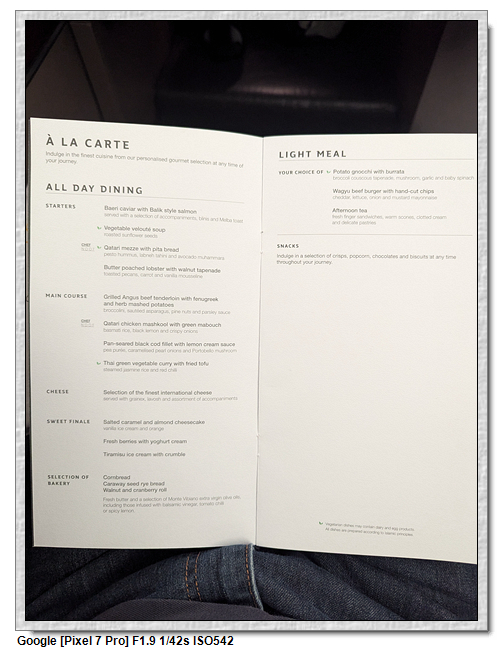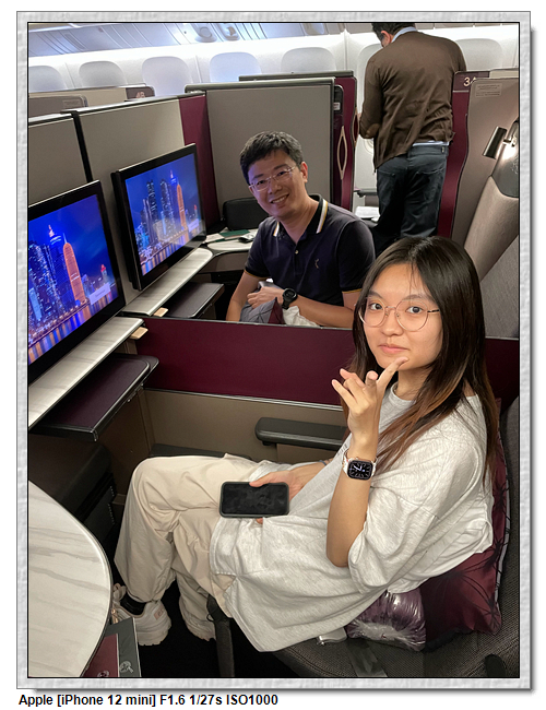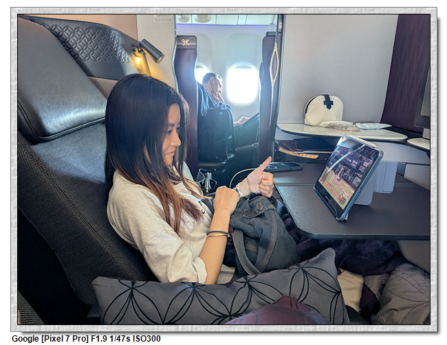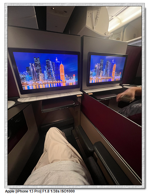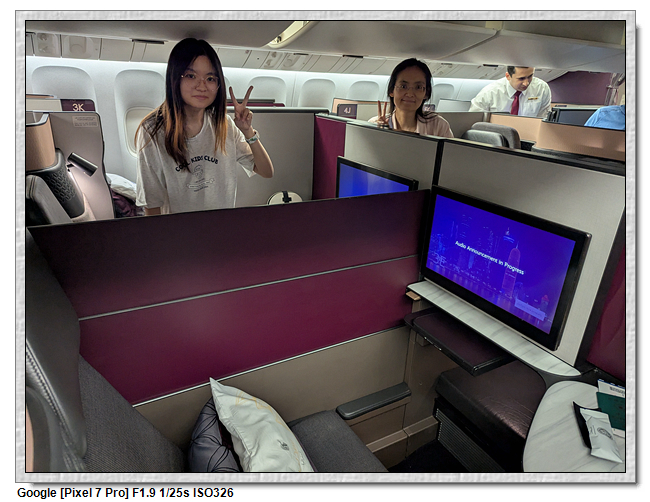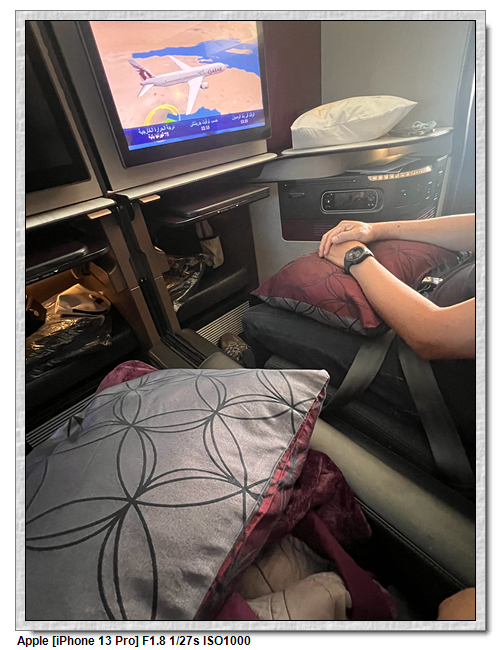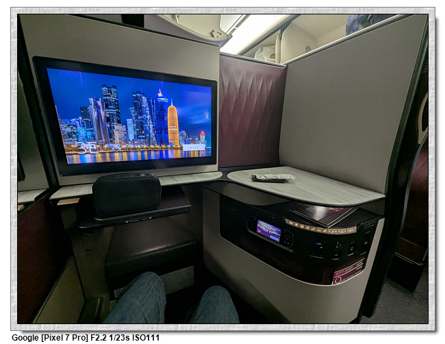 Qsuite商務艙跟一班商務艙比較起來,除了同伴間可以沒有隔閡坐一起聊天之外,最大的優點就是隱私,一般商務艙的一舉一動,其他人都會看到,但Qsuite商務艙一旦關起門來,就是一個小型的個人空間,相當隱私。另外不知道是不是錯覺,Qsuite平躺的長度好像是短了一些些。