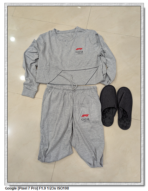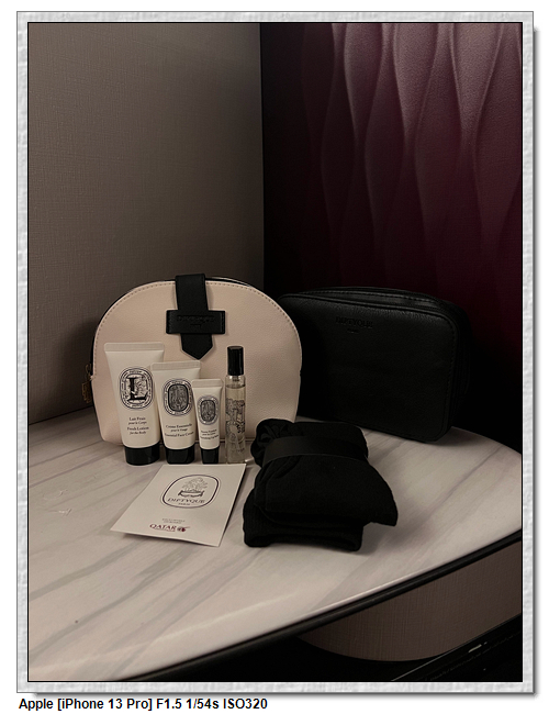 這趟旅程,意外地遇到台籍空服員,不知道為什麼她認出我們是從台灣來的,雖然不是服務商務艙,但一直跑來關心我們,還拿了三個過夜包以及三個睡衣,還有一些小點心給我們。