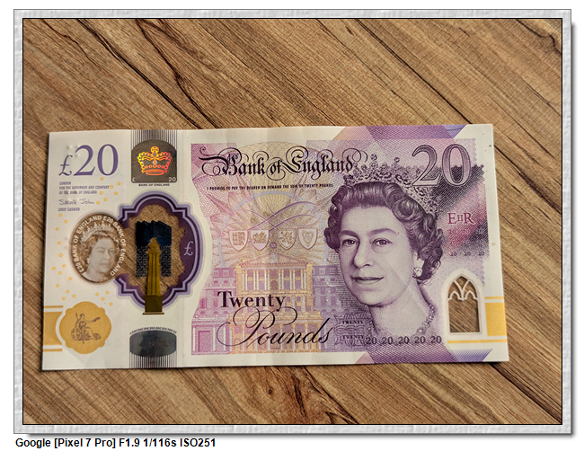此外,鈔票正面左下方有漂亮的全息設計,稍微轉動鈔票可以看到 Twenty 跟 Pounds 的字樣。