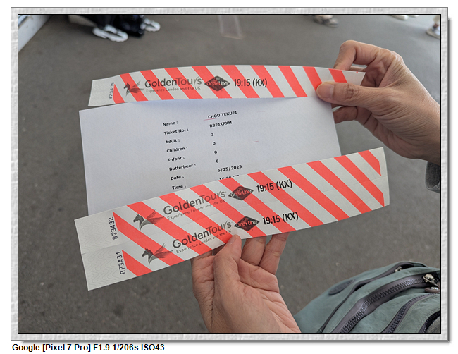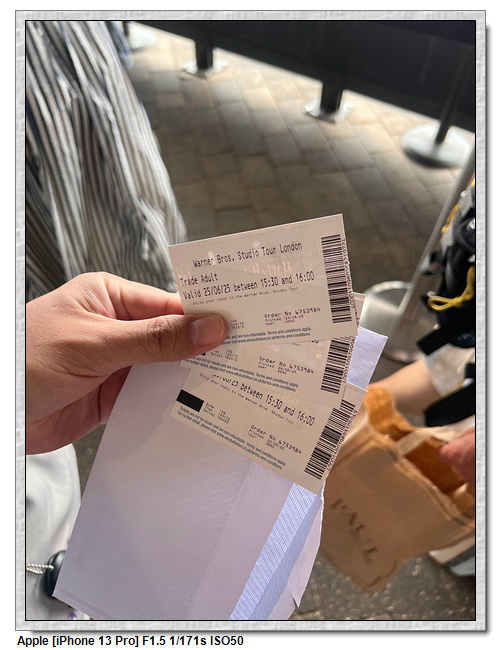 車程大約1小時20分就抵達哈利波特影城,大家陸陸續續地下車領票,我們則是最後下車,有一位穿白制服的工作人員在分票,領票時要報上名字,因為我們是最後一組,所以確認名字後就沒問題了,然後說往前走左轉就是入口。