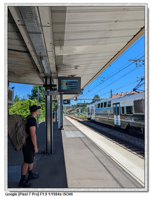 就這樣在用台等了30分鐘,也不見有車來,月台的資訊版也只說某一段會停駛,但不是我們這一段。突然原來列車的司機探頭跟一個人說話,看手勢的意思是可以開車了,然後那個人很貼心地跟每個人說可以坐車(聽不懂法語,但看手勢知道可以搭車), 然後我們就很快地走地下道抵達月台上車,司機也沒等很久,就開車了,整台車沒幾個人,最重要的是,原本沒空調,現在有空調了。所以還是不知道為什麼要趕人下車。
