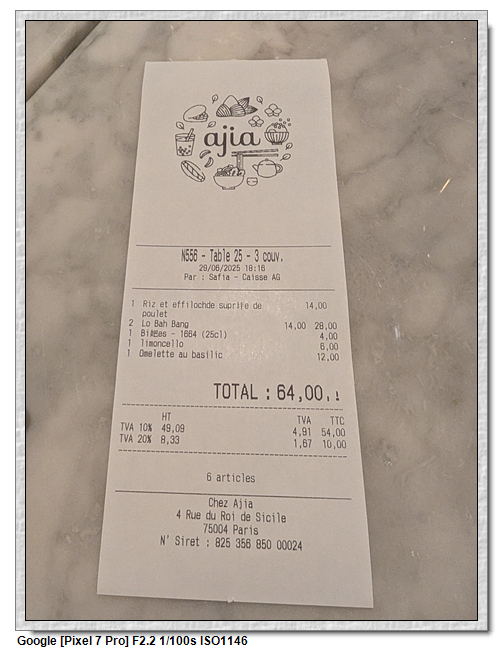 個人覺得口味很道地的台灣味,好吃,如果在巴黎想吃點台灣的食物,這家很推。一碗14歐的滷肉飯,昨天在羅浮宮吃的義大利麵一盤是18歐。跟在台灣魯肉飯與義大利麵相比的價格,就有偏高了,但我相信在巴黎價格是壓不下來的。