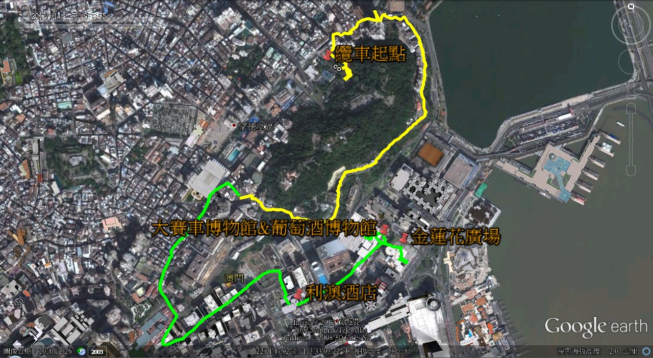 ▼【 從松山纜車 到 大賽車博物館;黃色線是走路,綠色線是坐計程車】