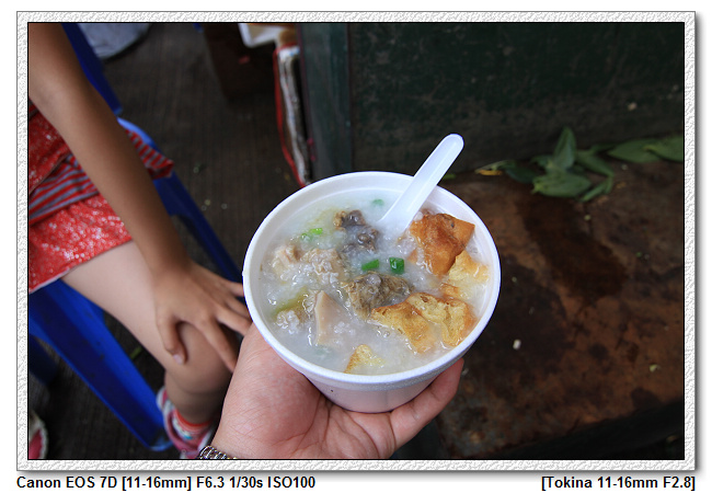 ▼【這是小羽爸第一次吃牛雜粥,很好吃耶;我們是拿塑膠板凳坐著吃】