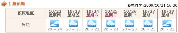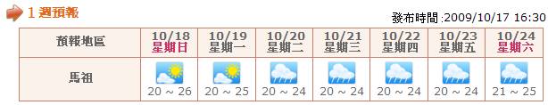 10/17的天氣預測,中央氣象局對於馬祖地區似乎不太樂觀,看來盧碧有機會一起去馬祖遊玩。