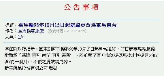 今天注意到台馬輪的消息,東引直升機送修了,原本有計畫搭直升機的行程沒了,好處是到東引的船班每天都有。不過如果船不開的話~~~也沒直升機可搭了。