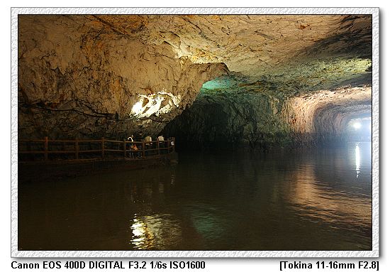 【南竿北海坑道內,壁上的深色處就是滿潮時的高度,會淹過走道】