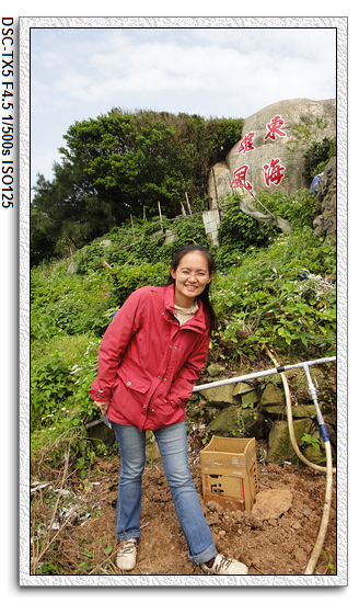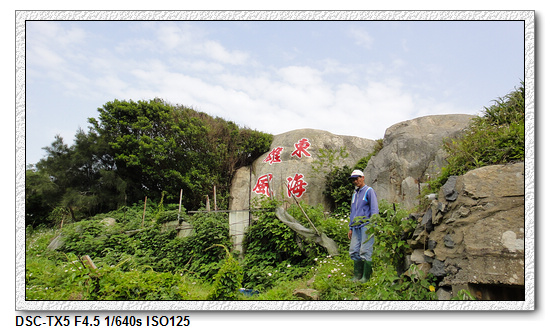 一開始並沒有找到「東海雄風」巨石。一直往下走,無意間透過一個木門縫看見巨石,當地人很友善的讓我們進入菜園,得以看見完整的巨石。