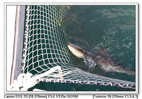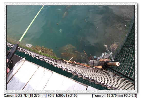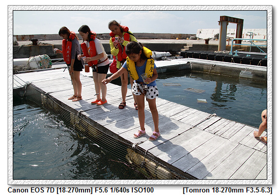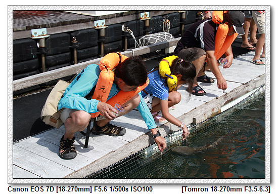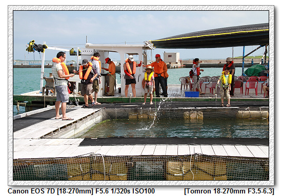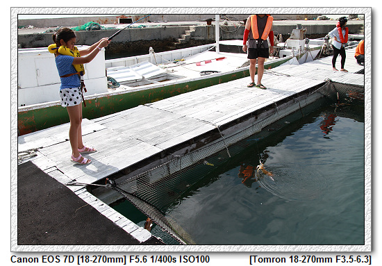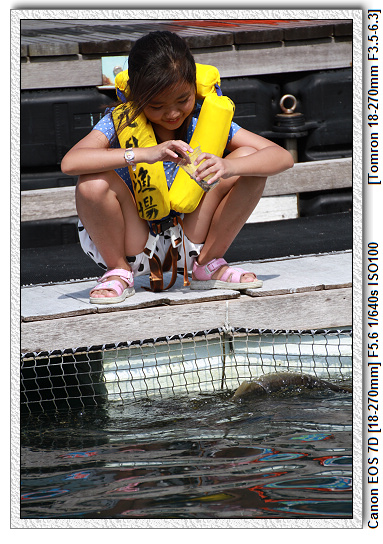 餵魚就是拿著小魚乾,在水面上晃呀晃,等待飢餓的魚上門。因為海鱺體型不小,所以轉身時會濺起水花,不小心會被濺滿身。