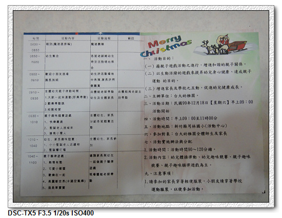 去年的此時,幼稚園是舉辦變裝晚會,或許是大家都覺得很累or麻煩,原本預期今年也會跟去年一樣有耶誕晚會,不過今年卻有不同的驚奇,而是舉辦親子遊戲活動。