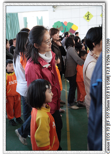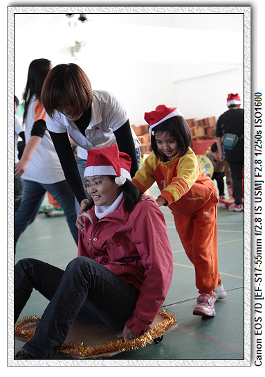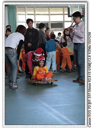 第二項遊戲是聖誕老人進城,是藉由小推車,一人坐一人推的遊戲,一開始小羽想要跟小羽爸一起玩(因為怕小羽媽不會推),後來看到示範有一段是小朋友推爸媽,小羽就反悔要跟小羽媽玩(怕推不動小羽爸)。