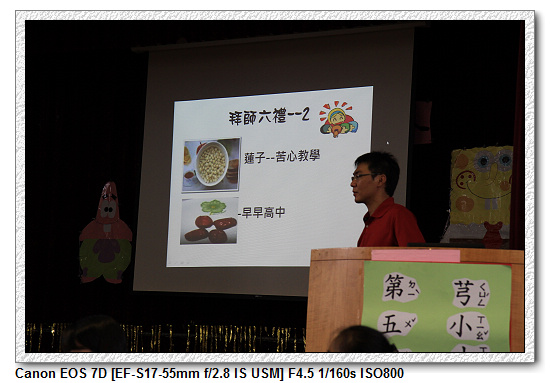 古人重視禮儀,要拜師學藝首重尊師重道和職場倫理,因此拜師時要有莊嚴儀式、沐浴更衣、準備敬贈禮。學校為了讓小朋友了解拜師的意義,也準備了六禮,六禮分別是肉乾(感謝師恩)、芹菜(業精於勤)、蓮子(苦心教學)、紅棗(早早高中)、桂圓(圓滿自在)、紅豆(鴻運高照)。