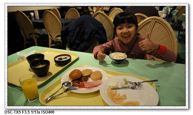 在這裡,小羽爸可是難得的早睡早起,一早 6:00 就起床。赫然發現外面正飄著小雪。昨晚天色不好沒拍到飯店的景象,一早補回來。