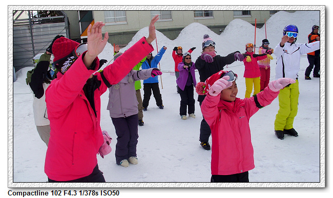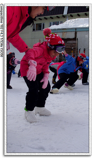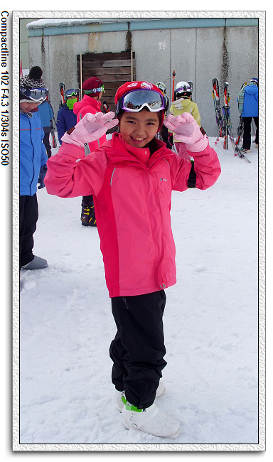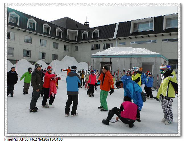 熱身完畢, 接著就是開始分班,初期先分有滑過雪&沒滑過雪(幼幼班)。接著一號纜車練滑一趟之後,小羽媽被分在待在有一點害怕的初階(5個學員),小羽&小羽爸則分在 不害怕的中階班(9個學員)。