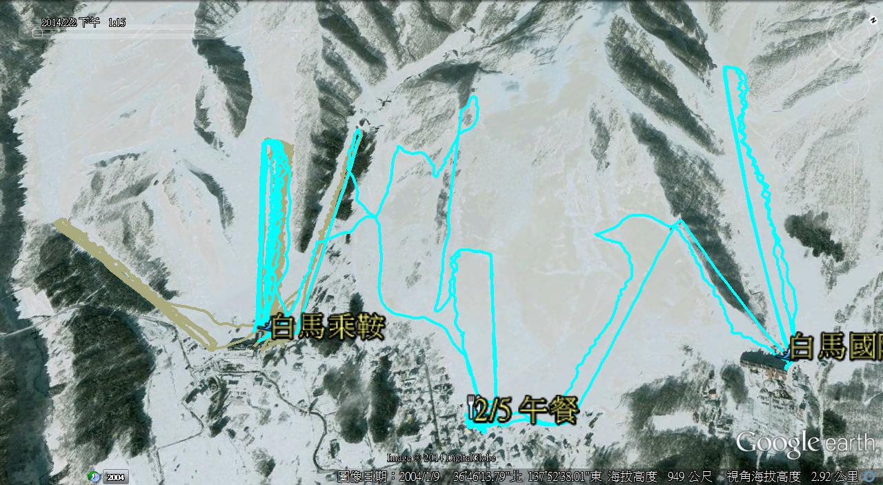 先在四號纜車練習,之後就拉往白馬國際。前往白馬國際的路上,險坡不斷,加上併腿姿勢的穩定性不夠,所以很多路都還是用A字腿。