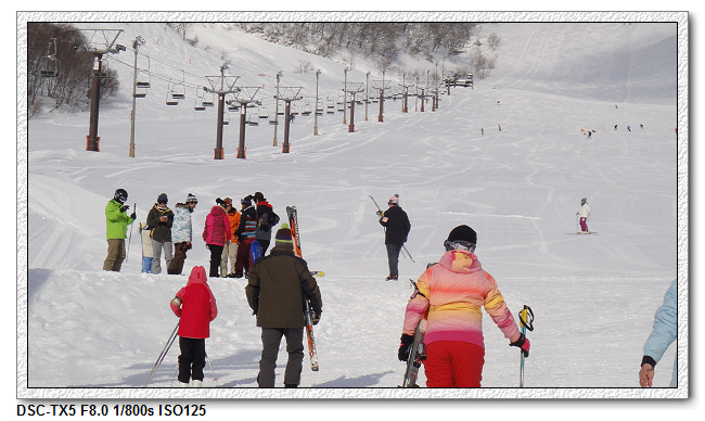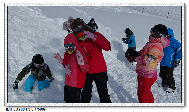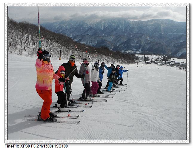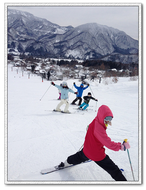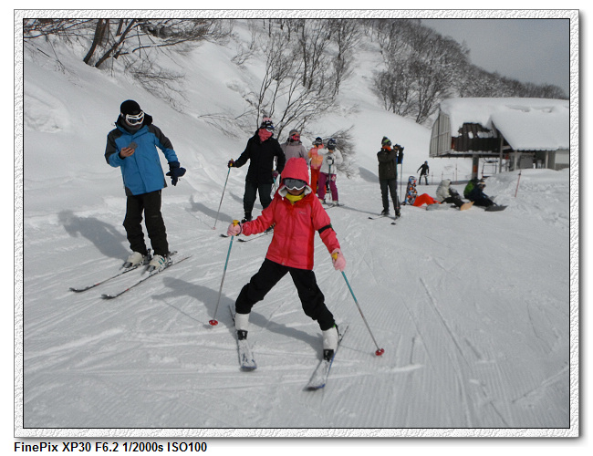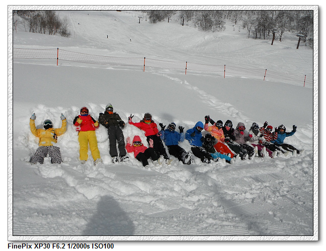 小羽媽部分,第四天一早總算出太陽,前兩天的大風雪實在惱人,早上初中階仍舊在旅館前的滑道(4號)練習,開始練習前,先在雪地裡拍照打滾,(這遊戲造成大部份的人手套都濕了!),而初階教練在第一趟除了有各自指導全自動轉彎的姿勢外,還新教了一個側滑的姿勢,側滑主要是滑板和滑道要呈90度角,放輕鬆地讓滑板往下溜,困難度是沒辦法很準確的判斷90度,如果角度不對,很容易歪掉,希望速度慢時,就用滑板往雪地裡切,理論上來說,這是遇到陡坡的保命大絕招,只是速度超慢就是了。