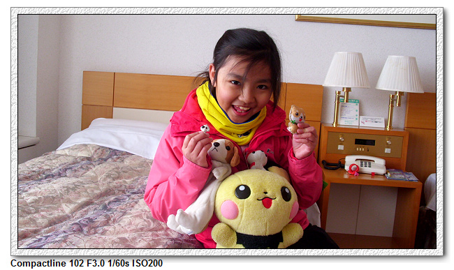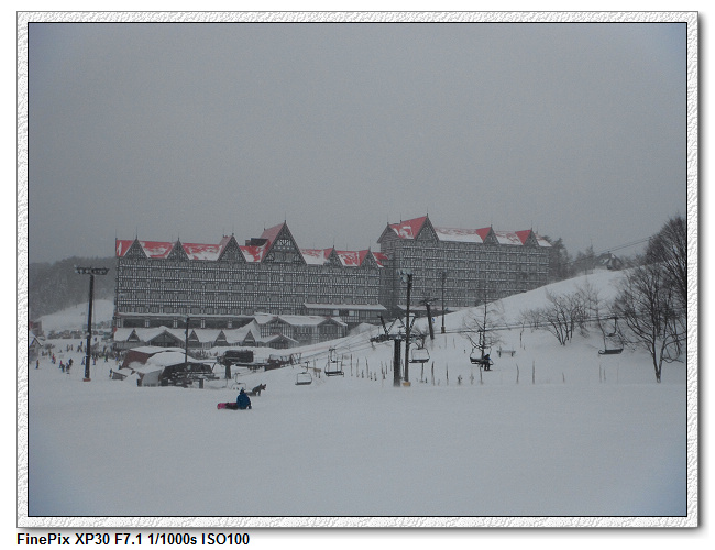 但滑回旅館前+一趟4號滑道就已經2點半了,風雪越來越大(其實是雪鞋內部是濕的,導致小羽、小羽媽手、腳冰冷),小羽一直唉唉叫,小羽媽就決定和小羽直接回旅館休息(為此,小羽還很乖地聽小羽媽話,答應要給拍照,等等) ,小羽爸則繼續在4號、5號滑道練習併腿,。