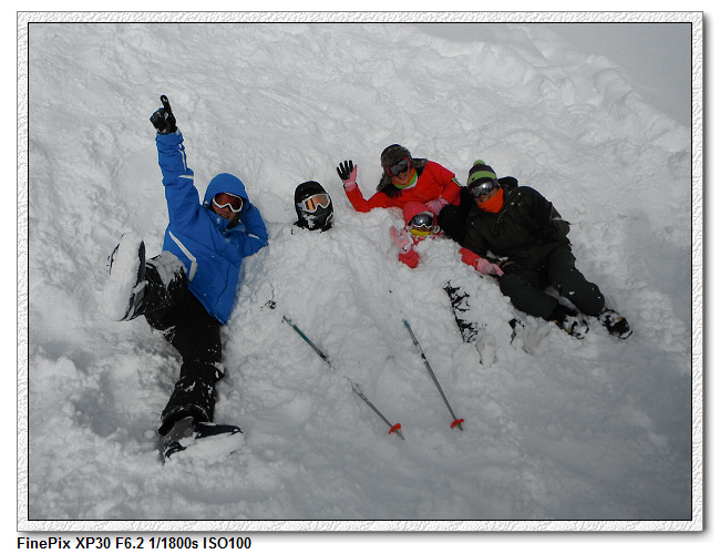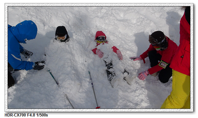 今天天氣特好,在四號纜車頂,特練特別找了一個完整的雪堆,讓大家依序躺在雪堆裡,滿有趣的。