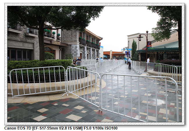 依據昨晚櫃台人員的指示,搭乘接駁車來到迪士尼小鎮,從側門入園。07:40左右上車,很快地抵達迪士尼小鎮,一下車便依據樂園人員的指示前往側門入口。側門入口已經用柵欄圍成一道迂迴的排隊長廊,這個時段不是說想進去就可以進入,首先會有警衛檢查房卡及房卡登記的人數(想要偷帶人的機會都沒有)。之後走一段用柵欄圍成的長廊,即使沒人還是要繞著走。之後便是安檢以及入園柵欄。