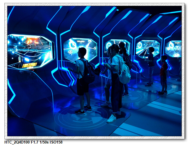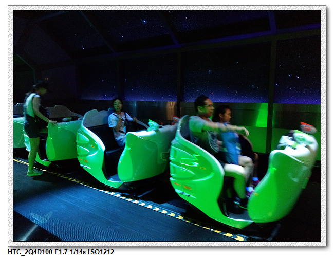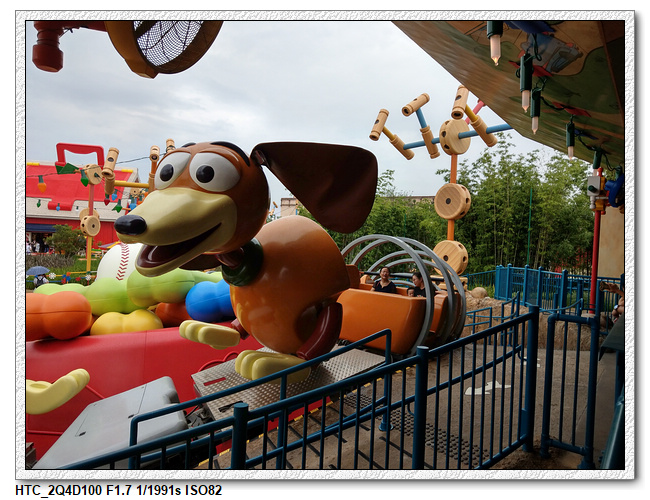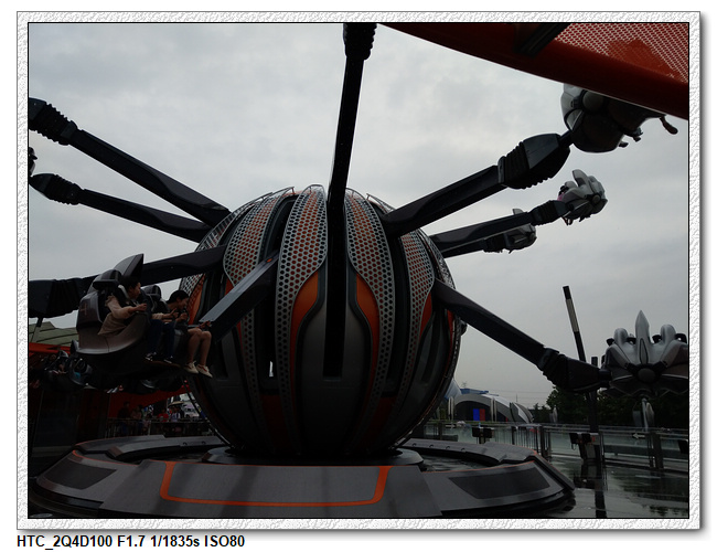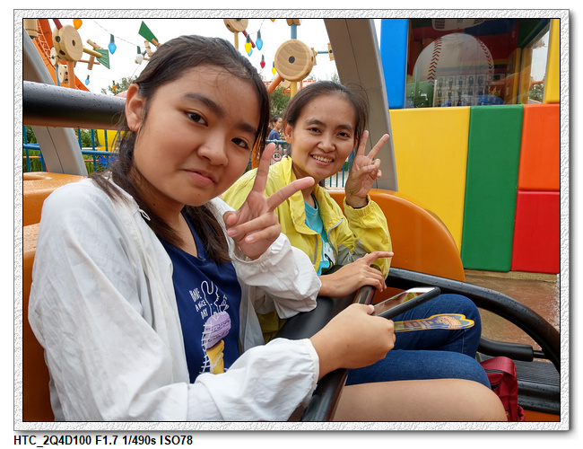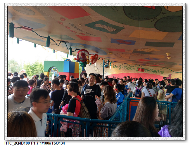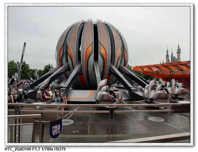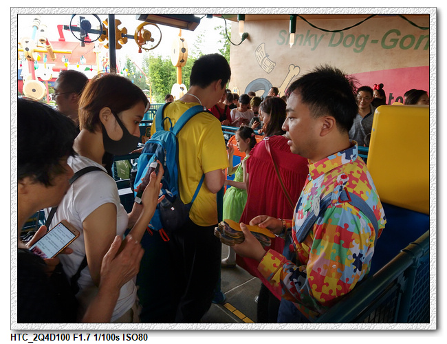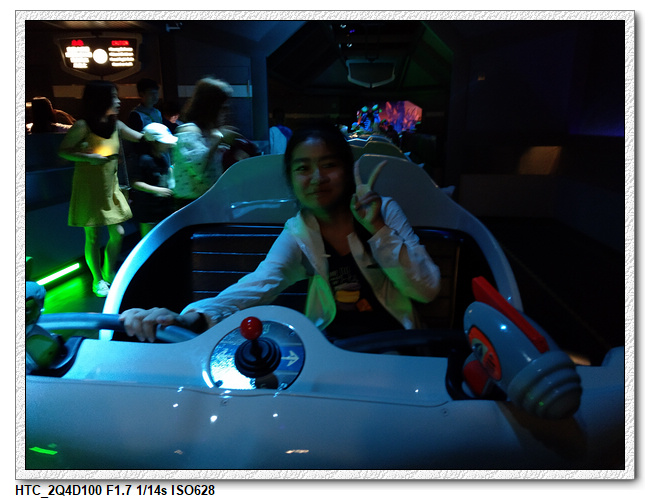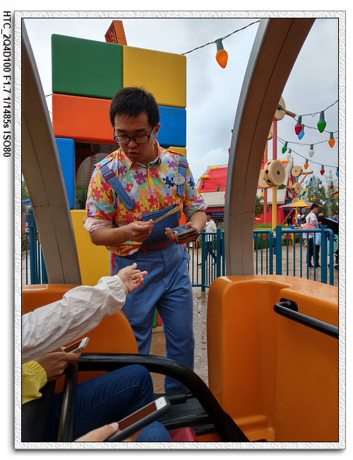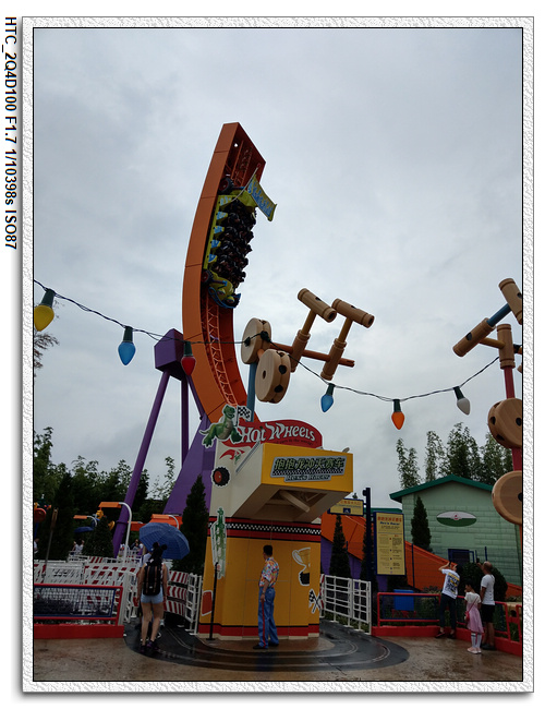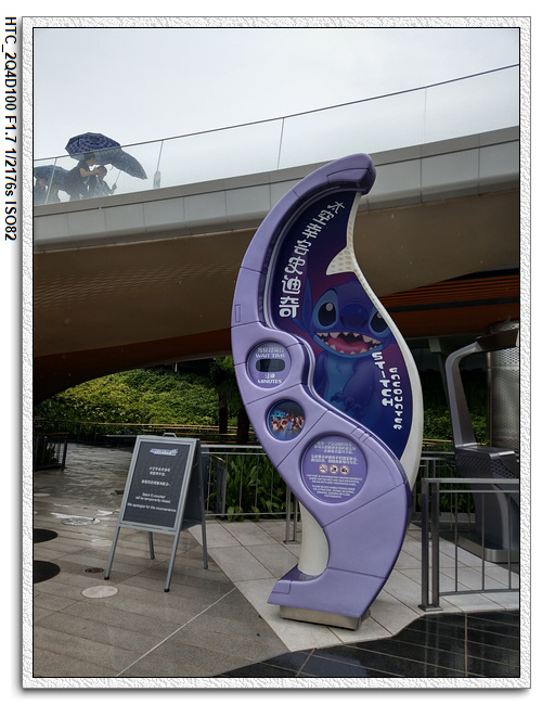 創極速光輪,一開始小雨還很害怕不敢玩(還不小心排在第一台車),結果一趟下來之後,小羽竟然喜歡上這個設施,後來晚上結束前又玩了一次。之後在老車站商店排隊等達菲+傑拉多尼拍照時,跟前方一位當地媽媽聊天(據說他們已經來迪士尼大約20多次了,是買季票),光輪已經有降速過,目前大約是80公里的速度,剛開幕時是120公里,很多人結束後都被送到旁邊的醫護室。