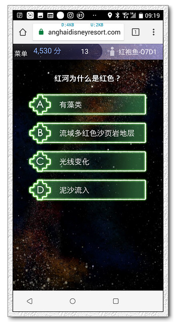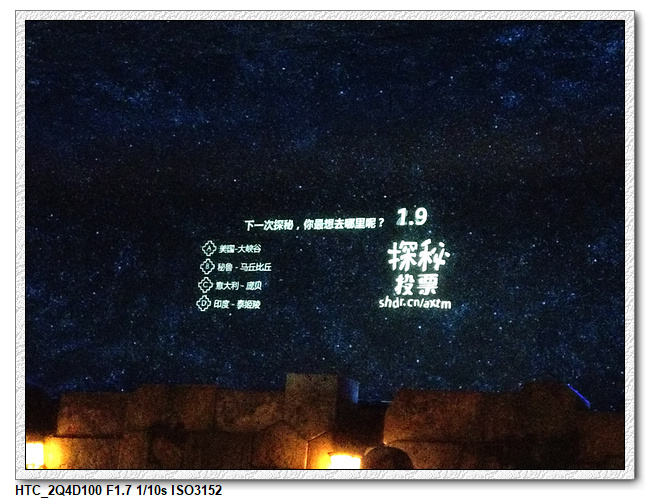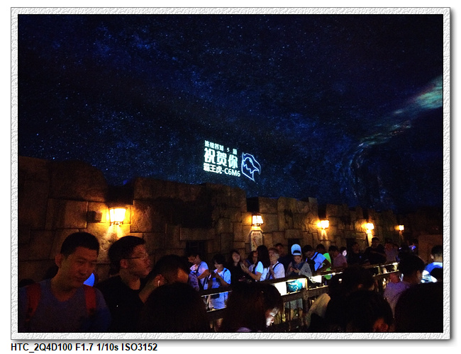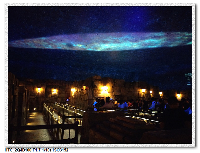 進入大洞穴之後,第一 眼就是滿天的銀河星空,巧妙的利用投影以及燈光營造出星空,的確有讓人驚豔的感覺。同時,為了解緩排隊時的無聊感,透過QR code加入線上的問答小遊戲,一分面轉移注意力,一方面也可增加知識。如果能夠連續答對五題,會把你的名字秀在牆上(不過是代碼)。