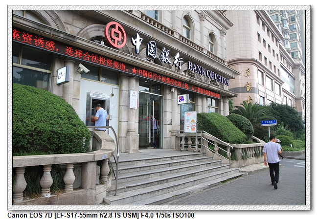 外灘待沒多久後,就搭公交車前往城隍廟。而在城隍廟的下車處,剛好有個中國銀行,我們嘗試去問問辦理戶頭帳戶的限制,結果需要工作證明才能辦理,看來我們想要辦理大陸戶頭的想法破滅了。