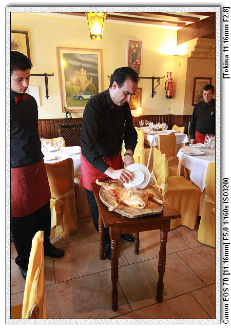 烤乳豬的作法是選用出生三週左右的小豬。先把小豬浸在牛奶及香料內(當然已經屠宰了~),大約浸泡5-7天(聽說天數是機密),利用牛奶的酵素將小豬肉的肉質纖維分解,之後才燒烤。這樣的烤乳豬相當嫩、酥、脆。此外,為了證明烤乳豬的有夠脆、有夠酥,不用刀子切割,直接用桌上的盤子當刀子。傳言當年的廚師為了向國王證明烤乳豬的酥脆,隨手拿了桌上的盤子就切、切、切,之後這就變成傳統,也成為塞哥維亞烤乳豬的豋場方式(據說有點店家為了證明盤子並無作假,不是拿鋼板的盤子,切完豬之後會將盤子砸地摔破,不過今天並無這樣做,每餐摔盤子可能會不夠買~)。