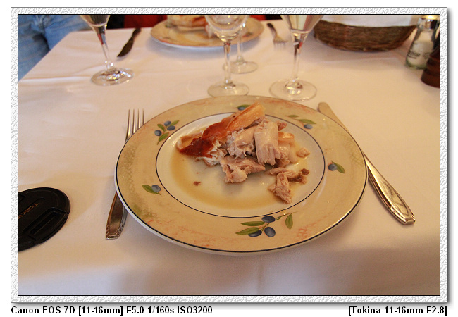 塞哥維亞的烤乳豬果然是最負盛名的料理,好吃耶~~~真的就像傳言中的嫩、酥、脆,皮脆肉嫩,雖然稍鹹(歐洲好像都是這樣,偏鹹,連我都覺得鹹,可見就是鹹),不過還是好吃~~~