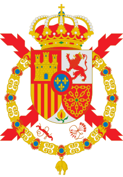 中心圖案為盾徽。盾徽上端有一頂大王冠,這是國家權力的象徵。盾面上有六組圖案:左上角是紅地上黃色城堡,右上角為白地上頭戴王冠的紅獅,城堡和獅子是古老西班牙的標志,分別象徵卡斯提亞和萊昂;左下角為黃、紅相間的豎條,象徵東北部的亞拉岡;右下角為紅地上金色鏈網,象徵位於北部的納瓦爾;底部是白地上綠葉紅石榴,象徵南部的格瑞納達;盾面中心的藍色橢圓形中有三朵百合花,象徵國家富強、人民幸福、民族團結。而外部一圈像項鍊子的東西,底部不是掛一般的十字架,而是金色公羊。其實我已經忘了那個代表什麼,只能稍微從網路上找到相關的紀錄。
