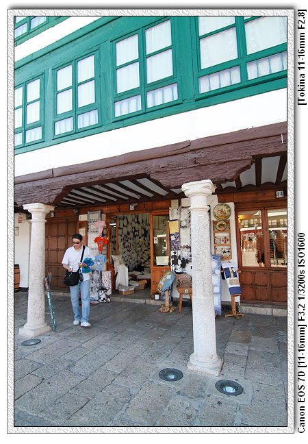 小鎮廣場特別之處,在於周圍的房子做成騎樓狀,一樓都是做生意的,二樓以上是民宿。騎樓式建築在歐洲算是少見,但還是有些地區因需求而將屋作成騎樓。不過在台灣到處可見。