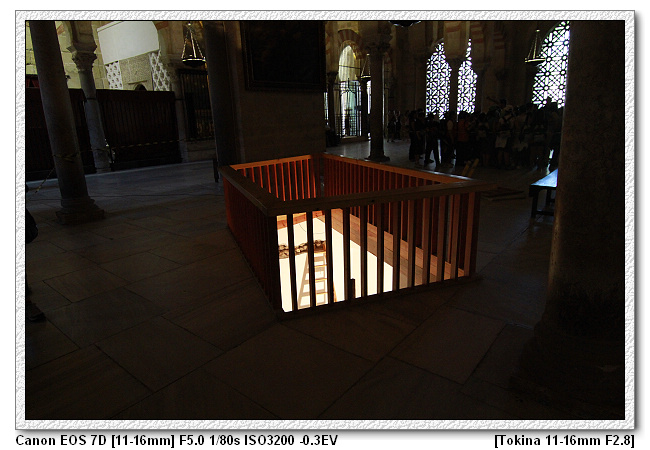 一進清真寺,先看到的是座五年前修復大理石地板時所發現的地下教堂,一開始以為是地下墓穴,但經過專業人士分析之後,原來是羅馬時期的教堂,可以說已經是1200歲了,裡面有馬賽克樣的石頭板所拼出來的圖樣。推測興建年代可能是5世紀時羅馬人興建的(當時羅馬人已經進入哥多華)。其實不應該說是地下教堂,因為教堂本來蓋在地表上 。