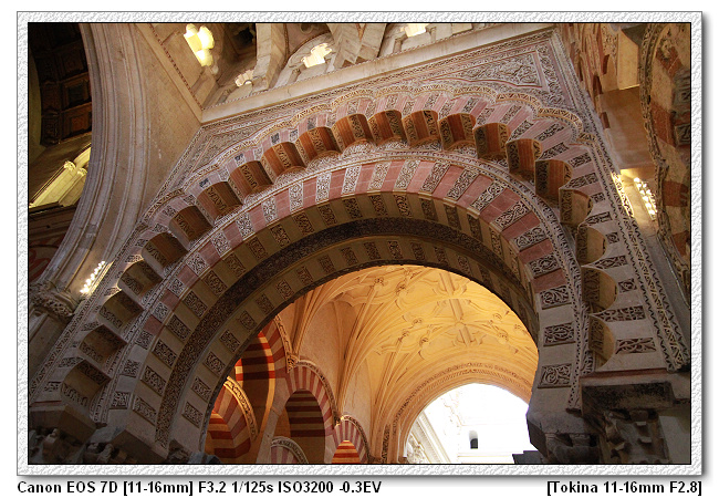 又過了100年,到了10世紀時,回教徒又更多了,清真寺又不夠用了,於是又再度擴建(我們稱為第三區,清真寺地圖黃色區塊)。這一時期紅白相間的拱形柱與前段已經不同了,除了樣式的改變,呈現多花樣。另外在紅白相間的之處,白色水泥已經不是平淡無花樣,而是呈現華麗的雕刻。