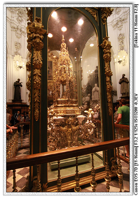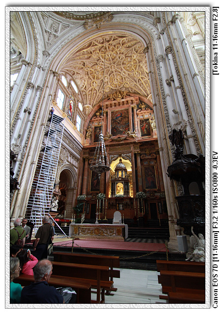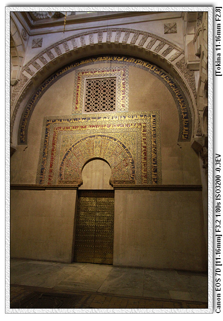 當時查理五世四處旅遊(文藝復興時期,15、16世紀),來到哥多華,參觀清真寺之後留下一句話,這裡怎麼沒有天主教的祭台,底下的人會了拍馬屁,於是便將清真寺裡面蓋了一個文藝復興時期天主教的祭台。