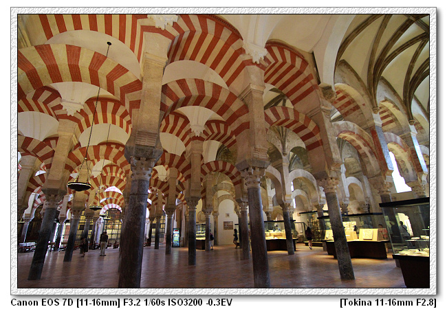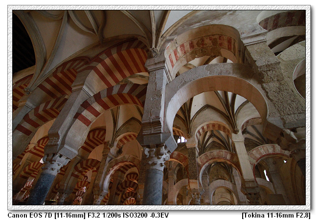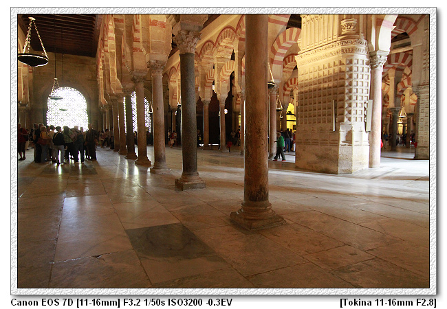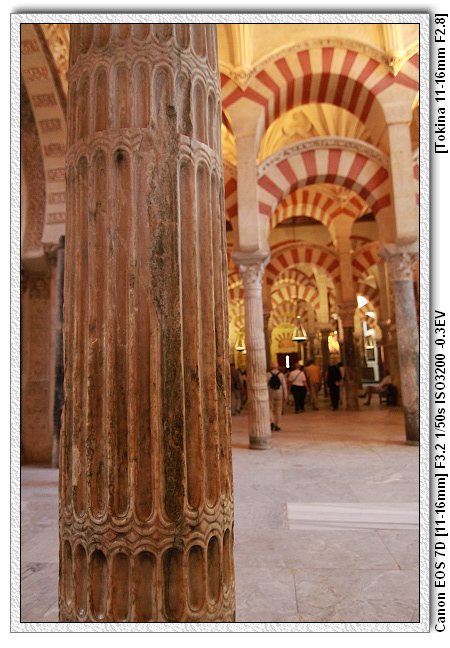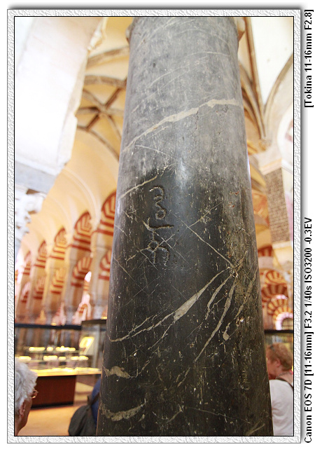 仔細看,可發現清真寺內的柱子每根都是不同樣式,也不同高度。因為當時摩爾王是很節儉的王,而底下的工匠也擁有這樣的特性,工匠一樣獻計,因剛到新的地方,為了節省經費,清真寺不需蓋的豪華,附近有很多羅馬人的廢墟,裡面有很多大理石柱子。於是將原本羅馬時期宮殿、神殿的廢棄柱子二次使用,這裡總共有1000根柱子。