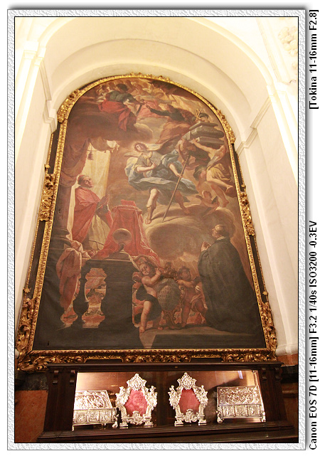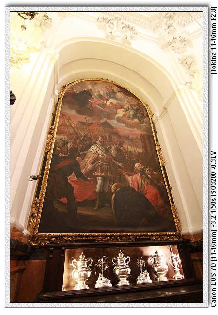 聖器室有兩幅重要的畫,一幅是戰爭場景,描述費迪南國王(是13世紀的費迪南,不是雙王那個費迪南)擊退回教王阿布杜拉馬三世的孫子(不知叫啥)。阿布杜拉馬三世死後,子孫越來越敗,終於在1236年拱手將哥多華讓給天主教國,之後退回到格瑞那達。
