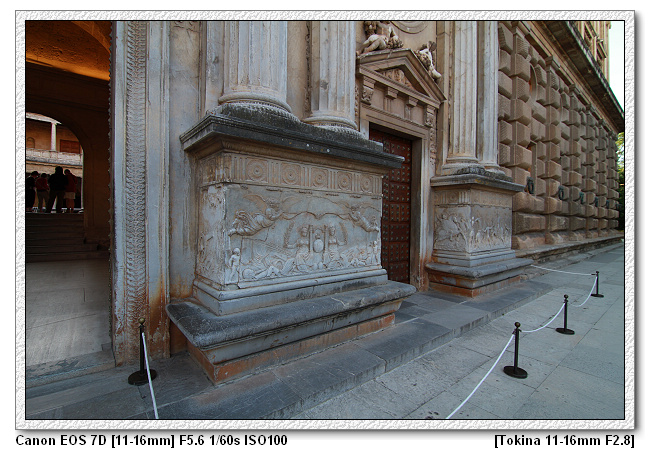 進入阿罕布拉宮,第一個建到的建築物,是卡洛斯五世宮(Palacio de Carlos V)。這是一座充滿文藝複興式的建築物,與阿爾罕布拉宮整體的伊斯蘭建築風格形成鮮明對比。宮殿建於1526年,也就是格拉納達回到基督教手中之後,是為卡洛斯一世(查理五世)的婚禮而建。很奇怪吧,明明是為卡洛斯一世而蓋,卻命名為卡洛斯五世宮。其實卡洛斯一世、查裡五世、卡洛斯五世其實都是指同一人,在西班牙的歷史上,應該稱為卡洛斯一世,但就神聖羅馬帝國而言,他是查理五世國王,但查理五世覺得自己很偉大,統制範圍超過西班牙,所以自稱為卡洛斯五世。