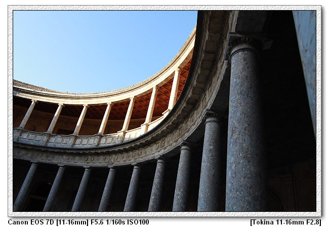 卡洛斯五世宮的建築師是米開朗基羅的學生,建築整體外方內圓,中間是寬廣的圓形庭院,周圍是兩層的柱廊。不過其實當初步未完全蓋好,只建好外觀,裡面的擺設並未完成,空空如也。現在這裡設有阿爾罕布拉美術館和格拉納達省立美術館。