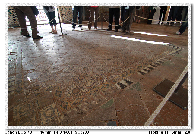 第二個不能踩進去的原因是,這一區的磁磚比較漂亮。這裡離地面有19公尺高,夏天通風,但冬天時卻會冷,於是地面會鋪上地毯,有地毯還不夠,中央會放上大火盆取暖。但有大火盆就不能鋪地毯,於是放火盆的地方就鋪上漂亮的地磚。