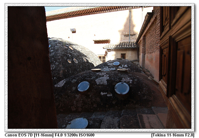 原本天花板是完整的,但現在去只有一半。這是因為後來拿破崙攻占西班牙時,曾拿這裡當作軍火庫。後來西班牙軍隊反攻時,哪裡管這裡是千年古蹟,只知道敵人在裡面,於是砲轟,大砲把另一半屋頂打壞了。
