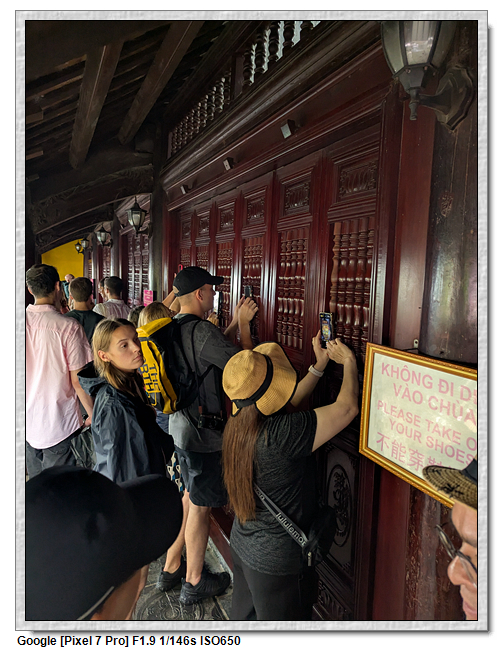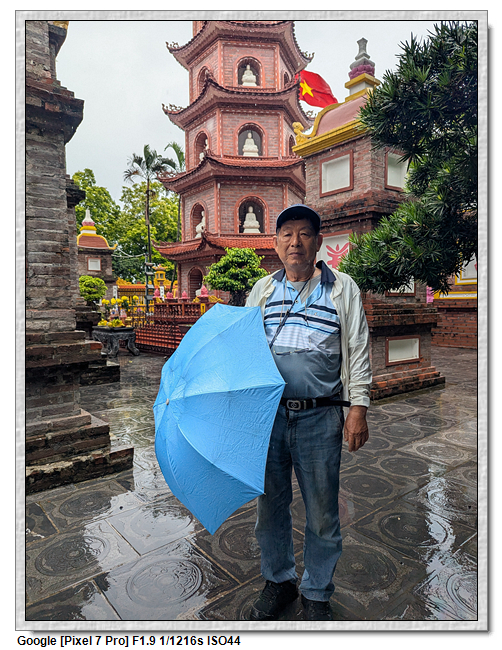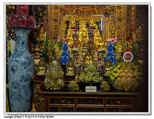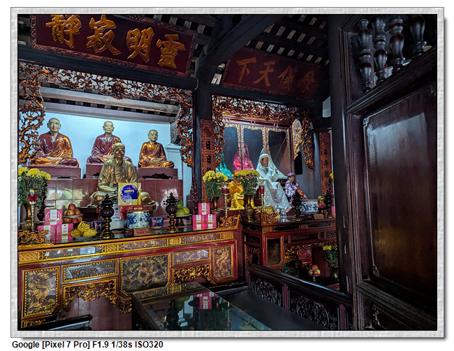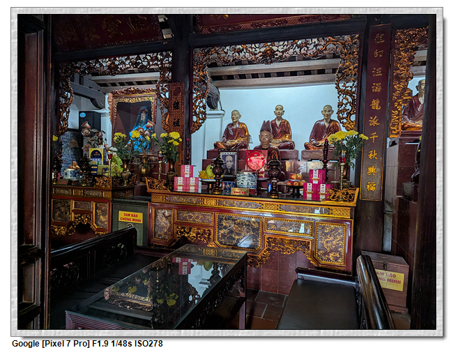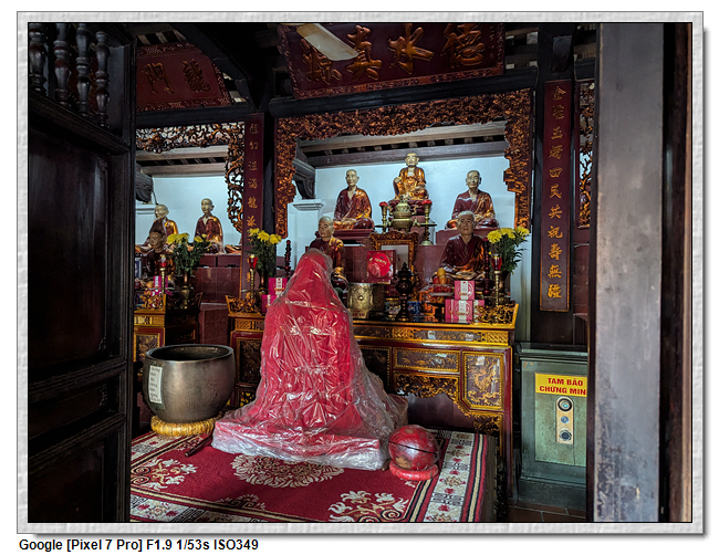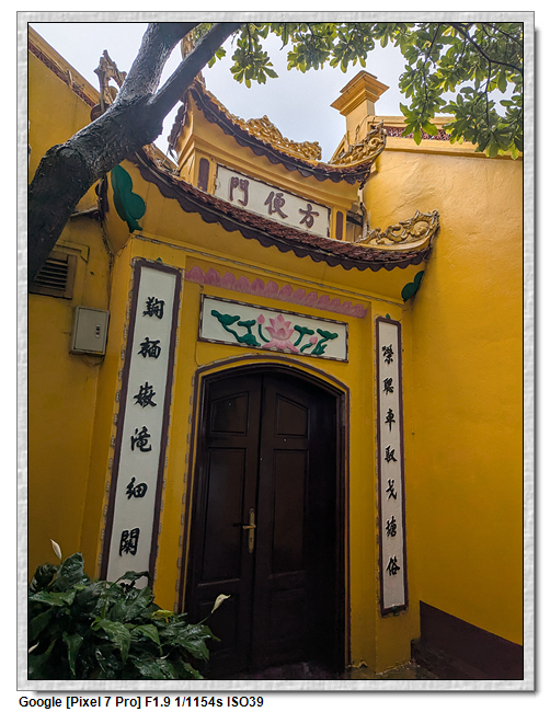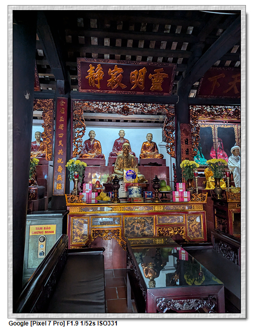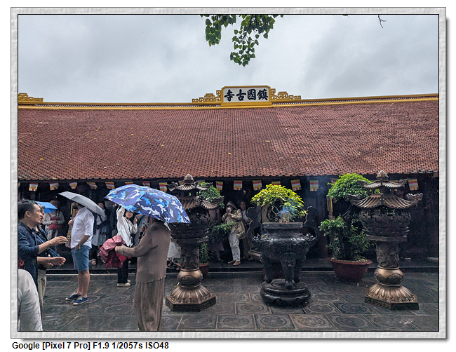 一開始,導遊問我們廟的上面是寫什麼,當然我們看得懂是"鎮國古寺",越南的古廟上的文字,大多都是以中文字為主,一般越南人是看不懂的。中文字一般以廟的年齡200年為界線,超過200年以上的都是繁體字,200年以下的都是簡體字(但簡體字的出現也不過是60年的事)。